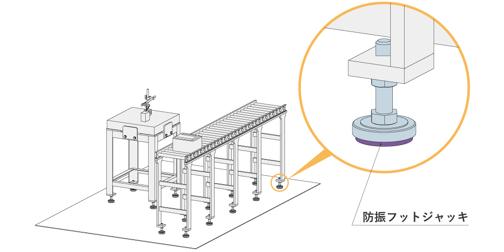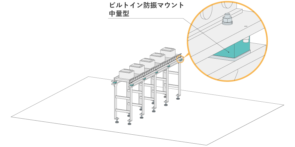 コンベアと足回りの間に設置することで振動を減衰できる防振マウントがあります
