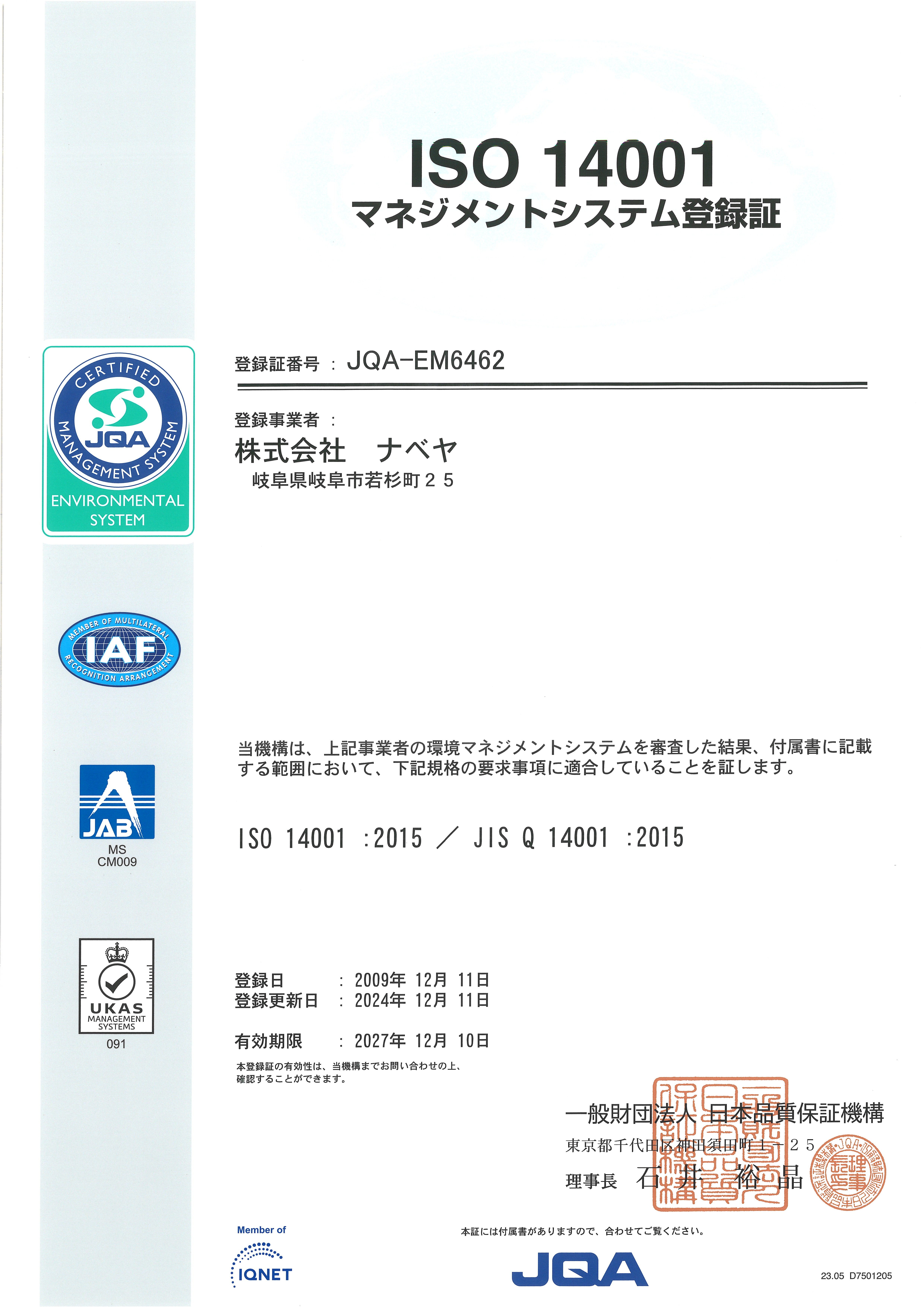 - ☆ISO14001:2015 環境マネジメントシステム 認証 2009.12.11登録