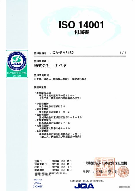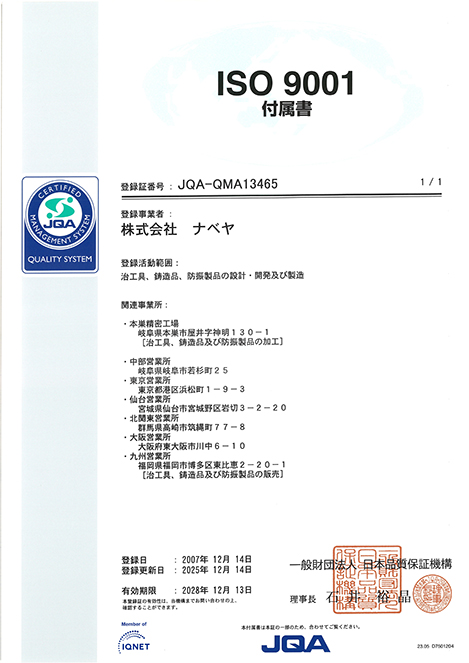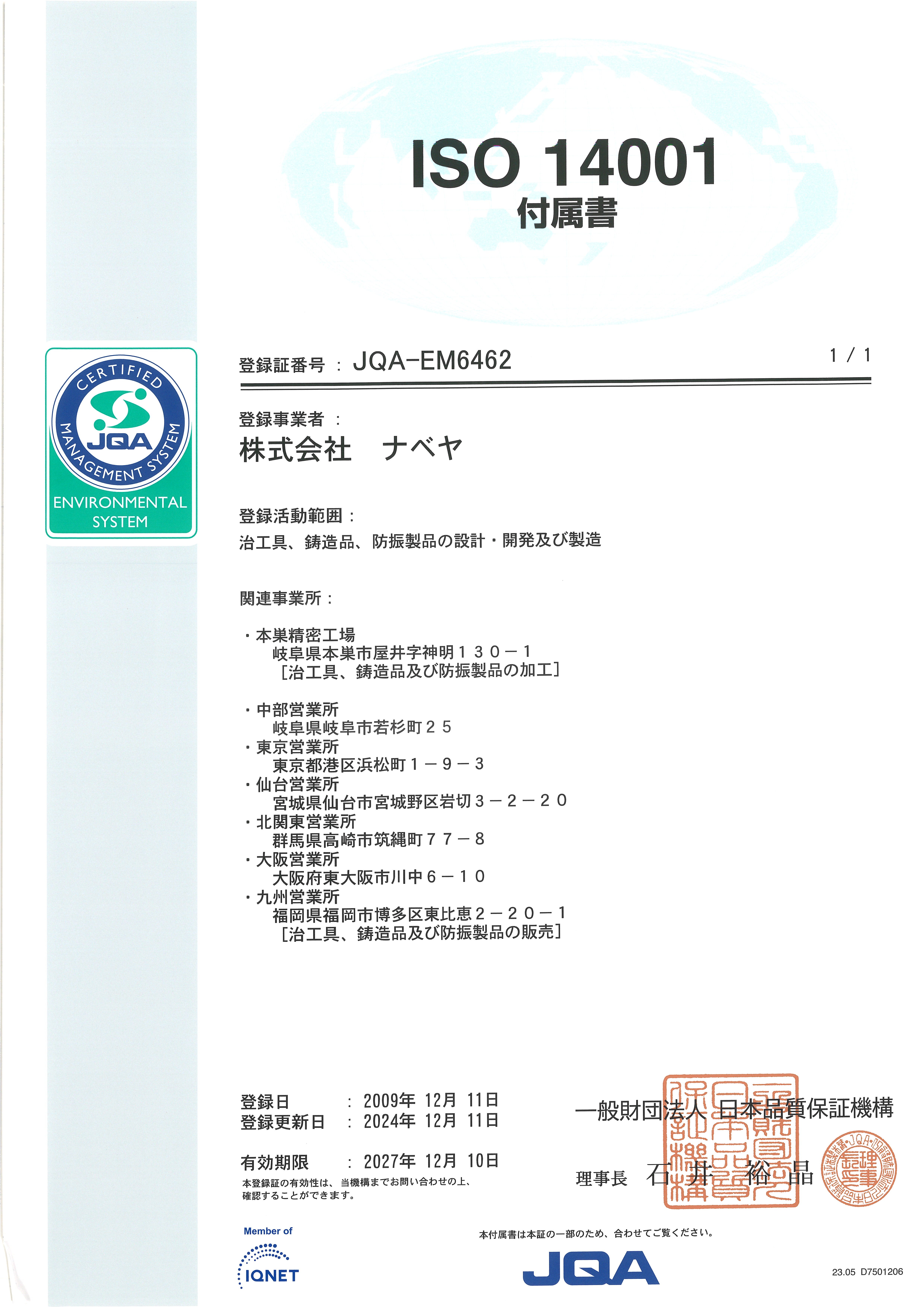 | 本社 | 株式会社ナベヤ 本社(岐阜県岐阜市若杉町25) 治工具、鋳造品、防振製品の設計・開発及び製造 (DESIGN/DEVELOPMENT AND MANUFACTURE OF JIGS ,CASTING PRODUCTS AND VIBRATION ISOLATION PRODUCTS) JISマーク表示制度 認証:JIS B 4621 横万力(丸胴形) |