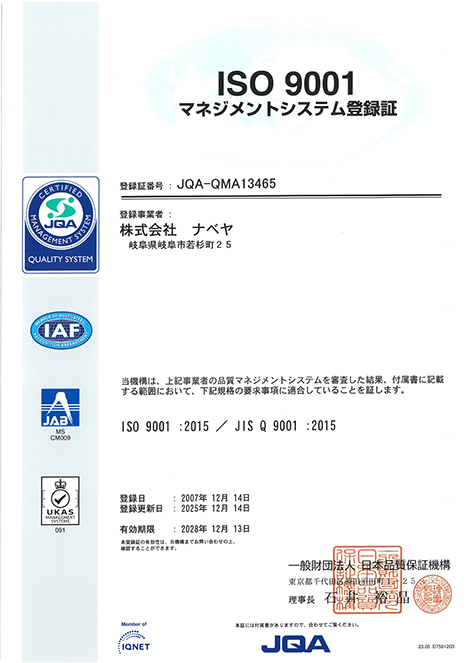 - ☆ISO 9001:2015 品質マネジメントシステム 認証 2007.12.14登録
