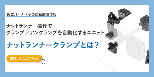 「作業者によるクランプ操作でバラつく段取り時間を均一にしたい」「クランプ力のバラつきで安定しないワーク姿勢や位置を改善したい」「設計/メンテナンス性に優れたメカニカルクランプで自動化させたい」 そんな課題を解決する製品が「ナットランナークランプ」です。
