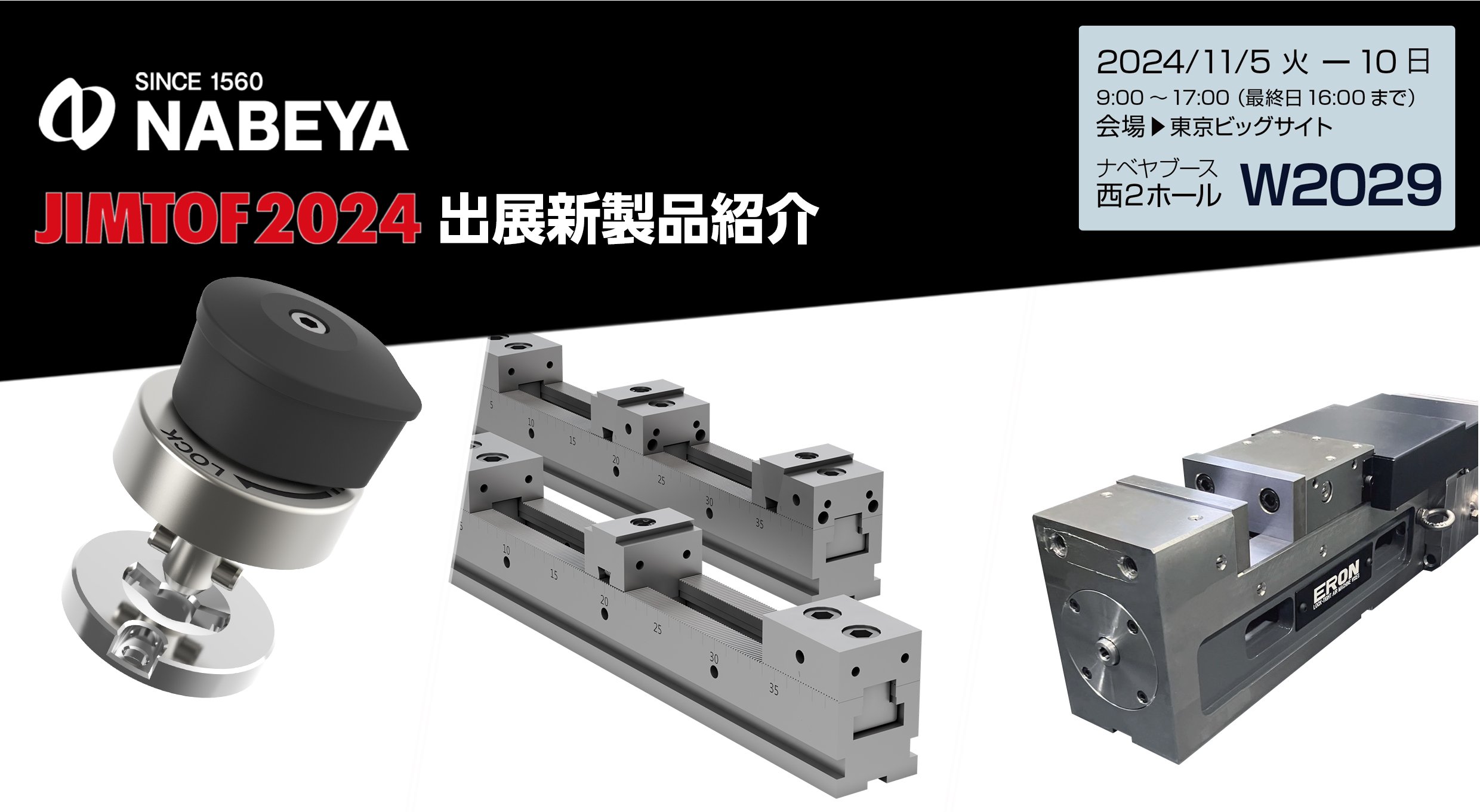 JIMTOF2024のナベヤブースのテーマは『マシニング加工の「工数削減」×「工程集約」×「自動化」に貢献』。