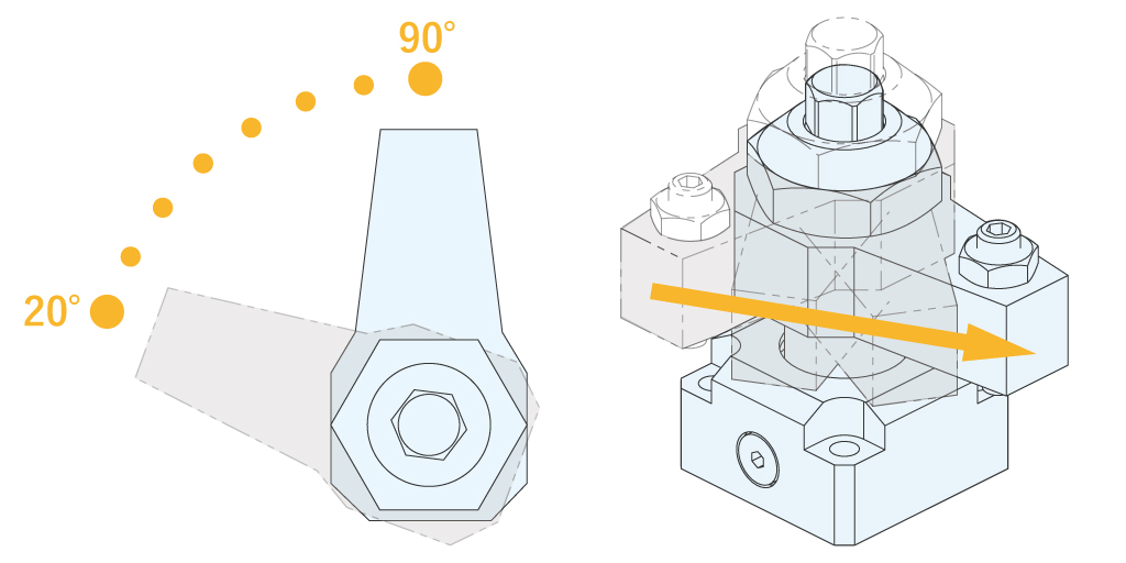 - 旋回角度は、10°ごとに選択が可能。旋回角度は、20°~90°で10°ごとに選択ができます。必要最小限の動作に抑えたい場合から、大きな可動範囲が求められる用途まで目的に応じた最適な角度をお選びいただけます。