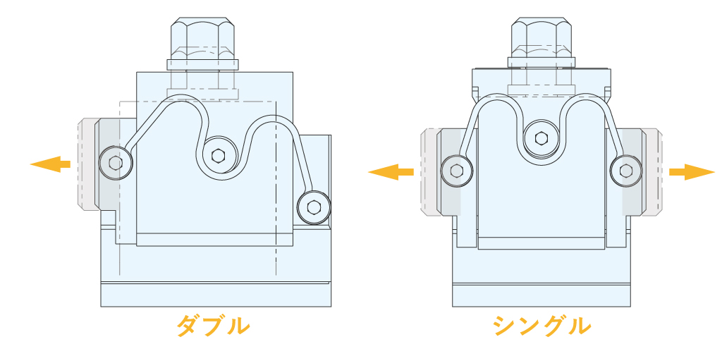 - サイドクランプは、ワークの取り数や用途に合わせて組み合わせてご使用できるシングル、ダブルのバリエーションをご用意しております。