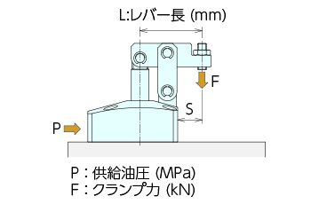 供給油圧 5.0MPa、レバー長 L=42mmの時、クランプ力は約2.6kNとなります。