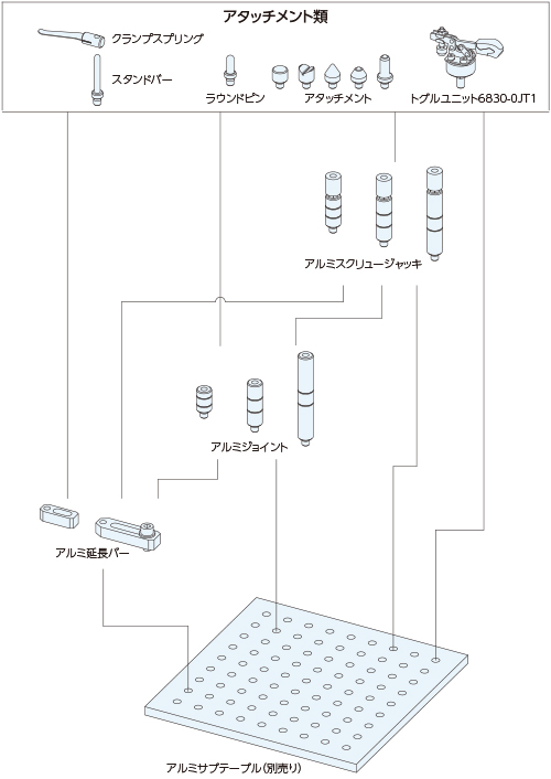 ワークの高さ、位置決めや固定方法に合わせて各構成部品を組み合わせて構築します。