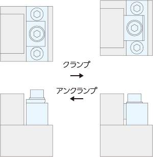 クランプ用ボルトを締め付け方向に回転することで、アタッチメントが本体クサビ形状に沿って下降し、クランプ面が水平に張り出してクランプします。