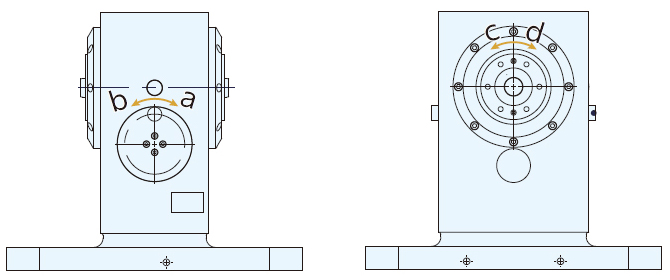 入力軸円盤側をa方向に回すと出力軸面板側はc方向に、入力軸円盤側をb方向に回すと出力軸面板側はd方向に回転します。