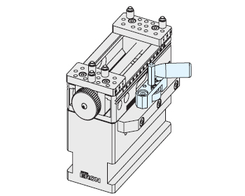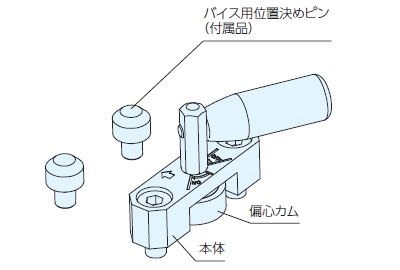 測定用バイスを側面から偏心カムの力で位置決め用ピンに押し付けることで測定用バイスが固定されます。