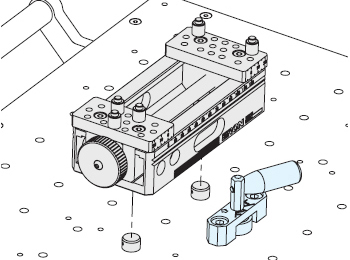 測定用搬送パレット(別売り)または測定用バイス嵩上げブロック(別売り)に取付けし、測定用バイスを位置決め用ピンにのぞませて設置します。