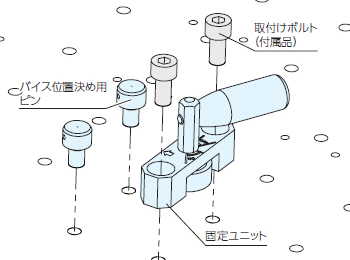 嵩上げブロック用アタッチメントの上面に空いているタップ穴にバイス固定ユニットを取付ボルト(付属品)で取付けます。