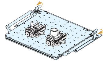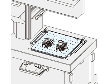 搬送パレットのタップ穴を使用し測定用バイスやジグを取付しワークをクランプします。