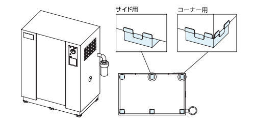 コーナー用はストッパーが2方向にあり、設備や装置の四隅に2方向のストッパーが当たるように設置します。