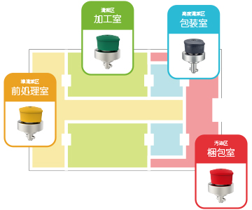 食品加工現場で、各食材/エリアごとで使用する色を決めておくことで、二次汚染や菌の増殖、異物混入を起こさない管理が可能です。