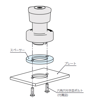 取り付けのプレート厚みが6mm未満の場合は、スペーサー(別売)を組み合わせて使用します。