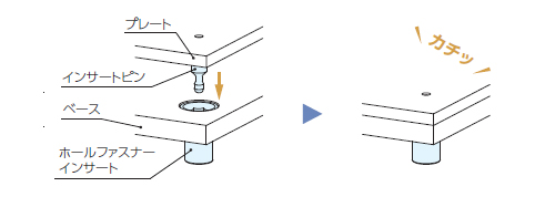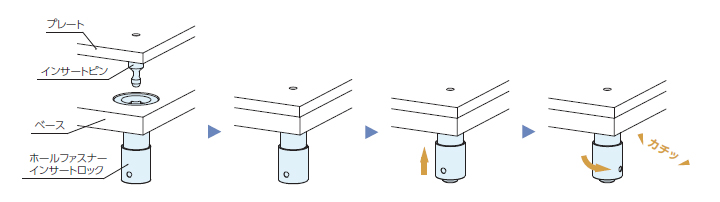 本製品を「ホールファスナー インサートタイプ」もしくは「ホールファスナー インサートロックタイプ」に差し込むだけで簡単にクランプ/ アンクランプを行うことができます。