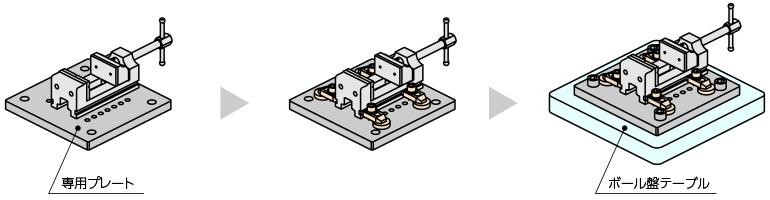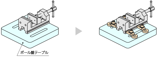 ボール盤のテーブル溝/穴と精密小型ボール盤バイスを固定するクランプバー・ボルトの位置が合致しない場合は、お客様で専用のプレートを設計/製作して取り付けてください。