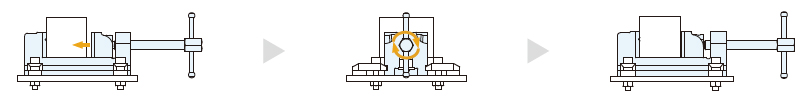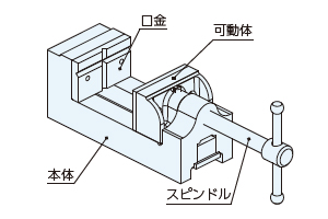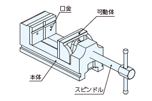 スピンドルを時計周りに回転させて、可動体をワークに当てることでクランプします。