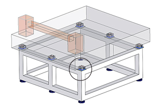 床とアンカー等で固定する場合はU溝部を使用し、レベリング上面または試験ベンチ上面に防振性能のあるワッシャー(ナベヤにて別作対応可)を通してからナットで固定する。