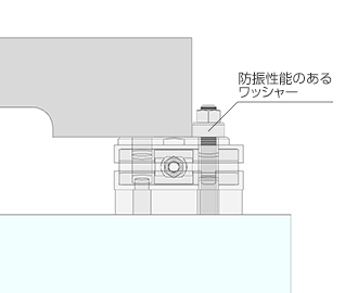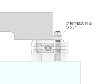 アンカーU溝使用時、レベリング上ナットの直接固定はしないでください。間に防振性能のあるワッシャー(ナベやにて別売対応可)などを使用してください。