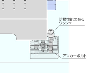 アンカーU溝使用時、レベリング上ナットの直接固定はせず、あいだに防振性能のあるワッシャー(ナベヤにて別作対応可)などを使用してください。アンカーを直接レベリングに固定すると振動がボルトを伝わって床から試験ベンチ(試験ベンチから床)に伝達してしまい効果が無くなります。