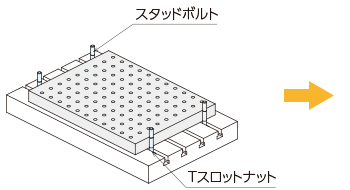 機械テーブルにMCサブテーブルを設置し、T溝にTスロットナットとスタッドボルトを取り付けてください。