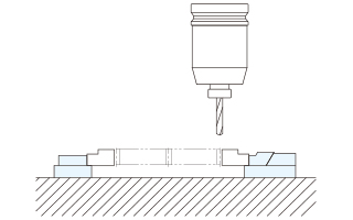 ■クランプ本体にワークを載せれば貫通加工に最適です。ただし、ワークが長い場合は間にドリル加工用のサポートが必要です。