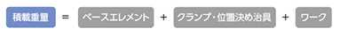 機械テーブル上の積載重量制限内で選定を行います。「ツーリングブロック(イケール)+ジグ+ワーク」の合計重量が機械側の積載重量を超えないかをご確認ください。