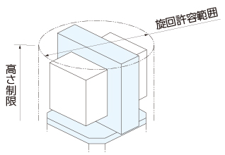 べースエレメントの高さにより、スプラッシュガードへの干渉が発生します。また、旋回などによる干渉エリアの規定があります。そのため、ツーリングブロック(イケール)・ジグ・ワークの組み合わせを考慮して選定を行う必要があります。