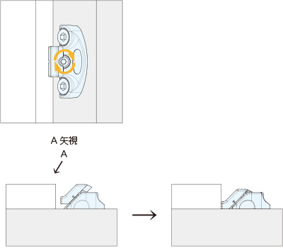 本体-可動体間のスクリューを締め付けることで、可動体が本体のテーパーに沿って移動し、水平方向に張り出してクランプします。