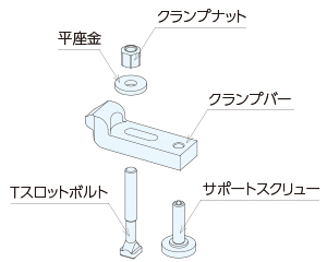 クランプナットを締めることでクランプバーが下がり、ワークを上からクランプします。