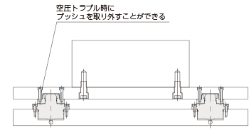 ・ブッシュの取り付け用ボルトはジグプレート上面から取り付けてください。空圧の空圧のトラブルにより、アンクランプできない場合の対応が簡単に行えます。