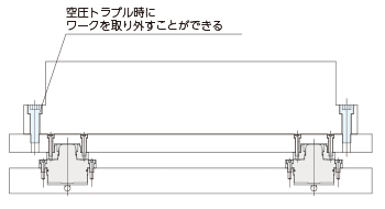 ・ブッシュの取り付け用ボルトはジグプレート上面から取り付けてください。 空圧の空圧のトラブルにより、アンクランプできない場合の対応が簡単に行えます。