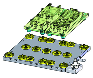 交換治具の大きさを数種類兼用し、ワークサイズでロット変更に対応