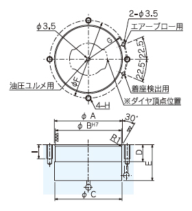 ※ダイヤピンは頂点位置とタップ穴とも関係が本図のようになっていますので、ダイヤの方向に合わせて、タップ穴と各ボート穴を囲う加工して下さい。