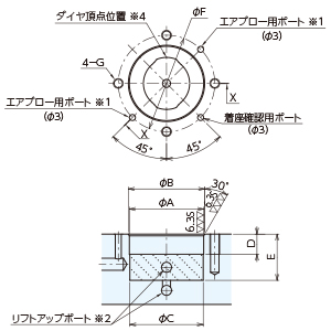 ※ダイヤピンは、頂点位置とタップ穴との関係が本図のようになっています。ダイヤの方向に合わせて、タップ穴と各ポート穴を加工してください。