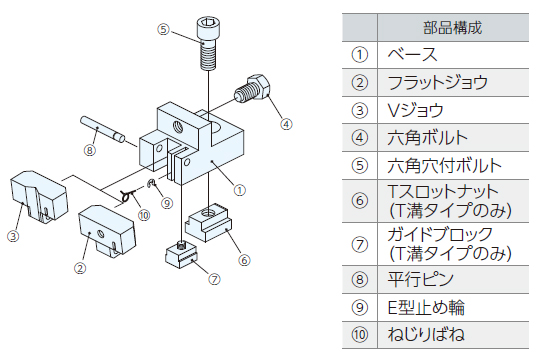 下方向に締付けるため、ワークの浮き上がりを防げます。 フラットジョウ(F)は、面・線でクランプしたい時にVジョウ(V)は丸物のクランプに最適です。