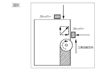 必要な保持力が吸着面に対して平行の場合は、その対策として、切削推力方向に対してワークストップ(ストッパー)を設置することで、吸着力を大幅に低減させることができます。(図8)