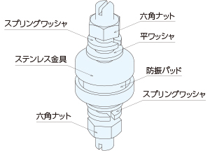 金具にはステンレス、防振材はエーテル系発泡ポリウレタンを使用しているため、錆びを気にする衛生環境下での使用に最適です。
