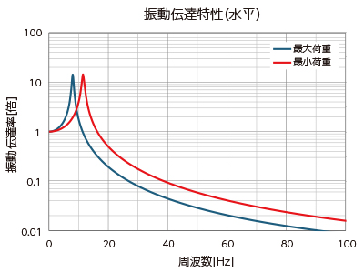 例:BBC12D007の場合、最大荷重0.55㎏/個の場合の固有振動数は19,5Hz、最大荷重の60%の0.33kgの場合27Hzになります
