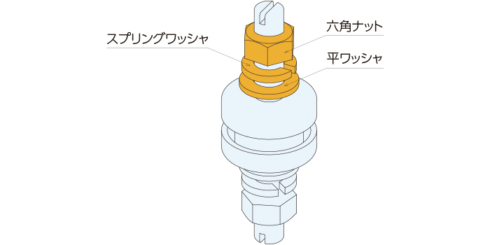 • 本製品についている下側のナット・平ワッシャ、スプリングワッシャを外し、本体を設置ベースに挿入します。その際、防振材がねじれないように、ボルト先端の溝をマイナスドライバー等で抑えて頂くか、金具をプライヤー等で抑えながら行ってください。