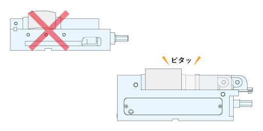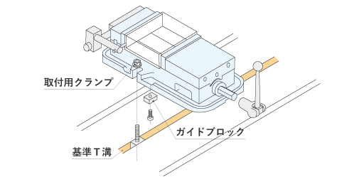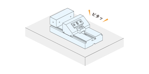 そのため、バイスを機械テーブルのピン穴や基準T溝を用いて位置決め・固定して平行かつ直角に取り付けできるようにすることが求められます。