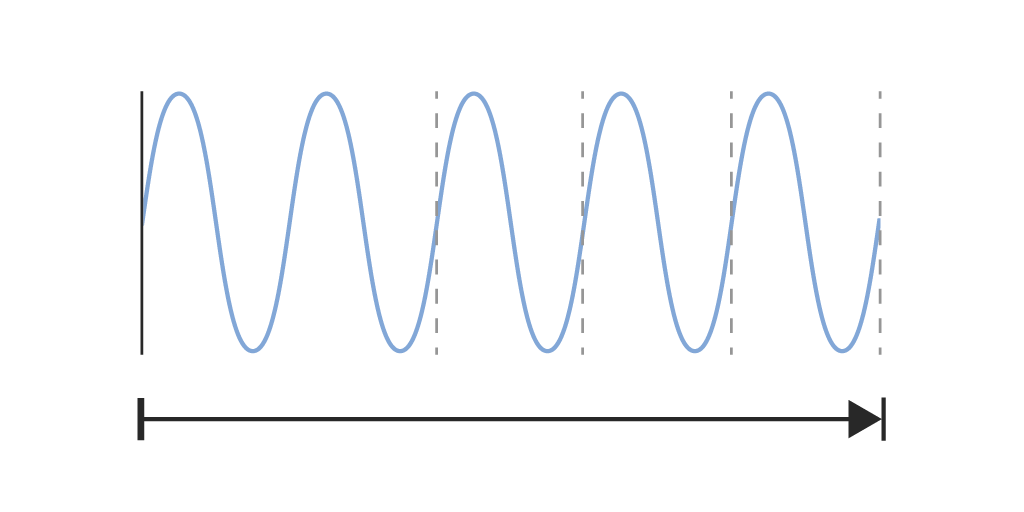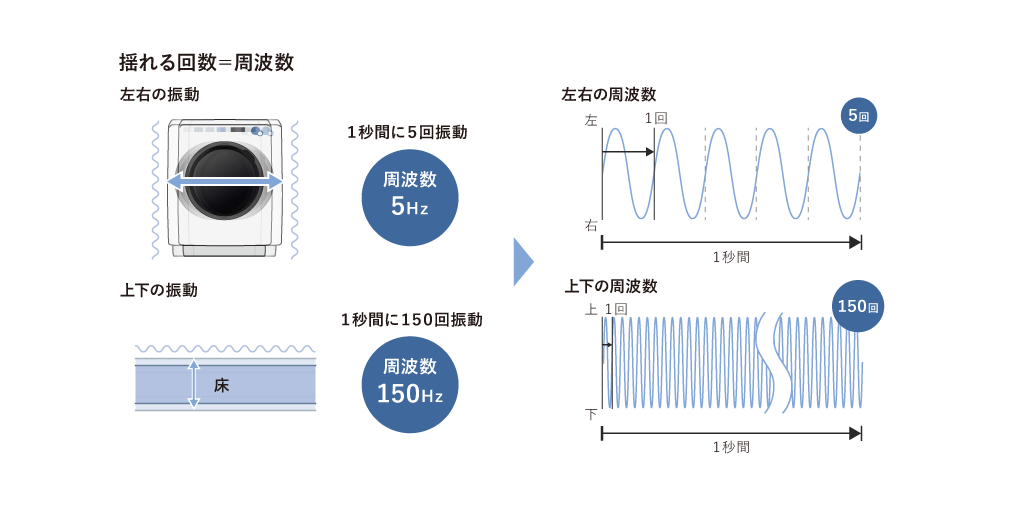 洗濯機のように大きくゆっくり揺れる振動は周波数が低く、床の小刻みに速く揺れる振動の方が周波数は高くなります。