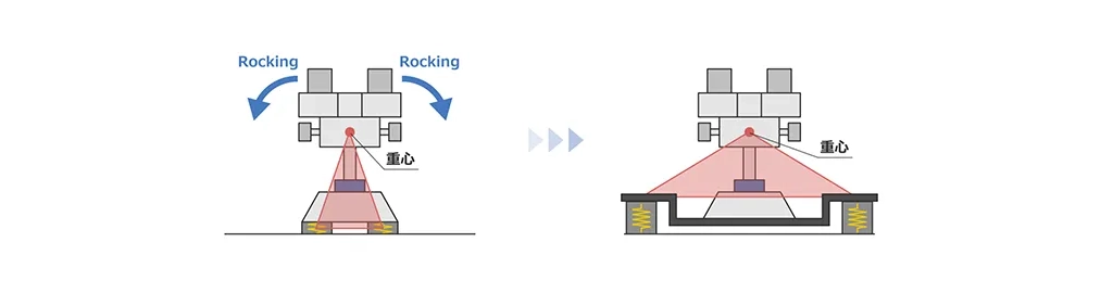 以下の図は懸垂型の形状の除振台にすることで重心を下げ揺れにくくしています。特に顕微鏡など覗き込むアイポイントを変えたくない場合に有効な対策方法です。